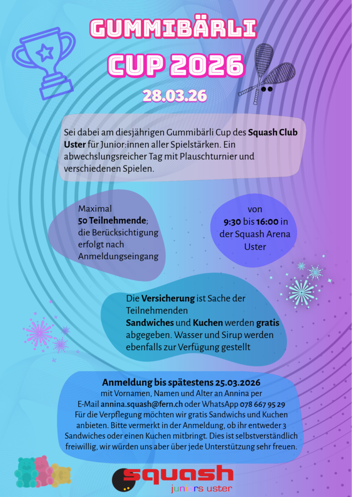Im PSA Closed setzte sich Robin Gadola durch und gewann vor Miguel Mathis und Fabian Seitz. Das Funturnier entschied Demian Oberhänsli für sich. Im Open triumphierte der Racketlonspieler Oliver Bühler. Herzliche Gratulation!