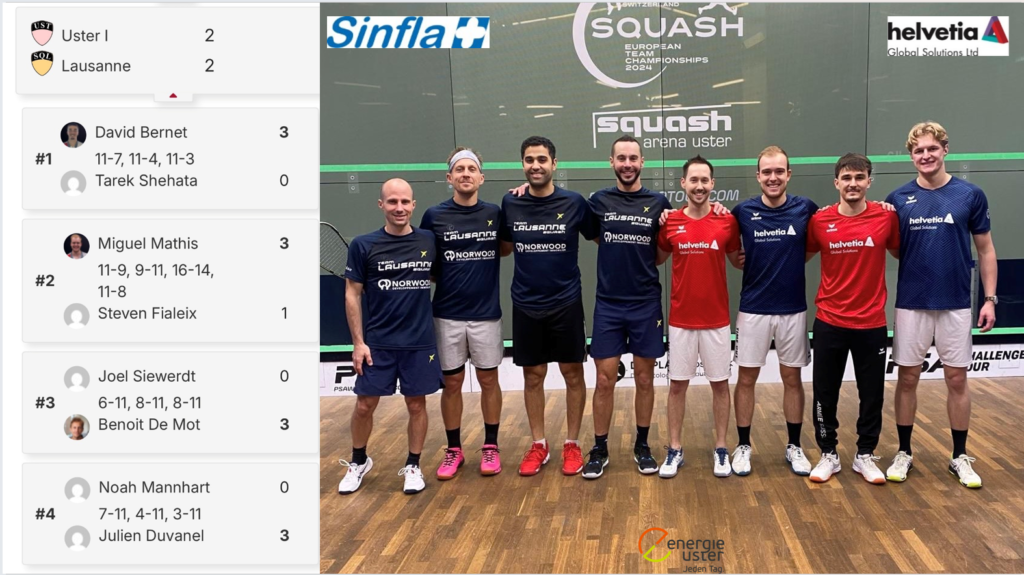 Uster 1 lässt gegen Lausanne wieder Punkte liegen. Trotz des deutlichen 3:0 von David Bernet auf Position 1, können die Teamkollegen nur ein 2:2 Unentschieden ins Ziel retten. Joel Siewerdt, momentan etwas ausser Form und Noah Mannhart, müssen sich 0:3 geschlagen geben. Miguel Mathis lässt die Zuschauer mehr zittern, als erwartet und gewinnt in sehr knappen Sätzen 3:1.